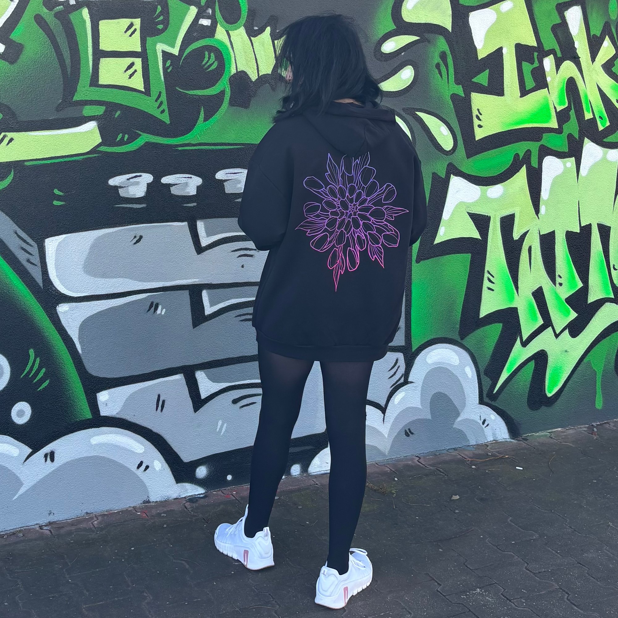 Soft unisex hoodie in black with large chrysanthemum flower back print and small script front print.